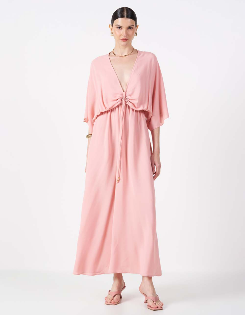 Vestido midi é confeccionado em tecido leve e fluido, garantindo conforto e movimento. O design apresenta mangas morcego amplasdecote em V profundo, cor rosa suave.— 100% VISCOSE